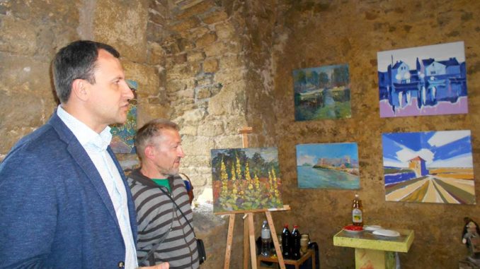 Симпатичный пейзаж с лодками Марины Рыбачук, несколько видов крепости, выполненных разными техниками, натюрморт с жизнестойкими желтыми мальвами на мольберте, огромный синий краб, берега лиманов, обнаженная женская натура, очень чувственная и почти беззащитная – полотна представляли широкую творческую палитру украинских живописцев. Сами авторы, за текущей работой которых можно было наблюдать по фото-отчетам Сергея Гарькавого, с улыбками слушали дифирамбы посетителей галереи, да и руководитель КП «Фортеця» Александр Морозов не скупился на похвалы. Особенного внимания был удостоен художник Евгений Семенюк за изображение крепости — к одной из башен собирающим направлением стремилось несколько дорог, а над ней, словно прорываясь в вечность, разлетались в стороны белые облака. Строение смотрелось как центр песочных часов, сосредотачивая в себе прошлое и будущее. «Хочется лететь, картина просто затягивает, она очень символична и перспективна» — констатировал директор, отмечая, что все дороги города ведут в крепость… Звучали слова о том, что полотно может претендовать на провозглашенной бренд нашего города, так что Женя Семенюк попал в яблочко. По-моему, картина уже принадлежит представителям принимающей пленэр стороны, так что, как решится ее судьба, пока остается за кадром… Александр Морозов поблагодарил художников Украины за разнообразную жанровую палитру, отметив, что прошедших в крепости старт дал свой положительный импульс. Авторы, в свою очередь, констатировали, что созданные ими этюды и картины не завершают бессарабскую тему, а служат трамплином для дальнейшего в нее погружения. Среди выставленных в зале работ особое внимание привлекали полотна Анатолия Фурлета с их спокойными, светлыми тонами и проступающими чертами символизма. Угадывающаяся за загадочными образами древней цивилизации башня Пушкина, женские фигуры, застывшие в пространстве и полные тайн – их надо видеть воочию, фотоснимки совсем не передают энергетику этих вещей маэстро. Воспользовавшись случаем, я попросила Анатолия ответить на несколько вопросов. Член Национального союза художников Украины согласился со мной, что светло-желтый цвет его работ прекрасно сочетается с каменными сводами галереи, стенами крепости, добавив, что и вообще с нашим краем. Отвечая на вопросы, Фурлет рассказал, что его оригинальная манера писать возникла спонтанно — теща работает в парикмахерской, где остается множество небольших флакончиков с узким горлышком. Наполнив их краской, Анатолий стал писать — «вийшло дуже просто, і тепер ми з дітками часто проводимо майстер-клас». Дело в том, что Анатолий живет не с продажи картин, а занимается с ребятами частными уроками живописи, однажды учил рисованию дочь начальника охраны президента Украины. По его словам, когда владеешь элементарной грамотой рисования, то техника исполнения может быть любой — можно брызгать любой краской, лепить, кидать ее, хоть ногой, но …на правильные места. Родился мастер на Прикарпатье, окончил художественную школу в г. Хотин, затем художественно-графический факультет Одесского педагогического университета. Тридцать три года работал учителем и директором художественной школы на Хмельниччине, потом, оценивая запросы конкуренции, переехал в столицу, купил себе дом. Ему очень понравилос