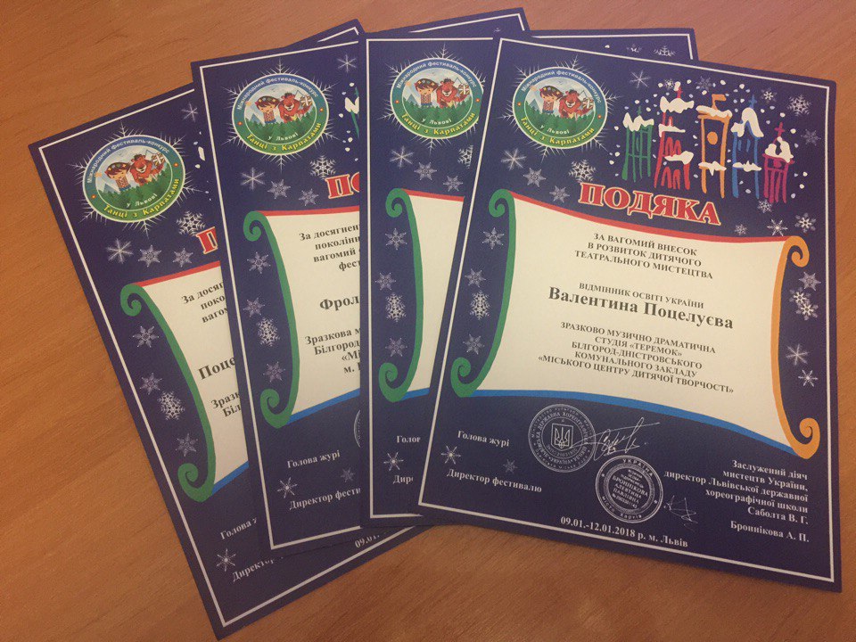 Результат – коллектив ГЦДТ был удостоен самой высокой награды – Гран-при «Танцев с Карпатами». Председатель жюри, заслуженный деятель искусств Украины, директор львовской государственной школы Саболат выразил не просто восхищение игрой ребят, он отметил актуальность материала и его высокую социальную значимость. Валентина Поцелуева и Галина Фролова были отмечены благодарностями за существенный вклад в развитие детского театрального искусства, за достижения в воспитании подрастающего поколения, профессионализм и весомую инвестицию в развитие фестивального движения Украины. Сразу после окончания церемонии награждения руководитель студии сбросила нам фотографию по вайберу – лица ребят просто светились от счастья. Когда мы отправляем коллективы на фестивали, то не ставим им задачу — обязательно занять призовое место, цель состоит в том, чтобы выступить хорошо. Важно то, чтобы все старались сделать все, что от них зависит, для того, чтобы достойно представить коллектив, руководителей, городской Центр детского творчества, родной Белгород-Днестровский, а в отдельных случаях и Одесскую область. Я всегда говорила о том, что наша задача – создать для каждого ребенка такую ситуацию успеха, чтобы ему захотелось пережить ее еще, еще и еще раз. Вы знаете, получить серьезную награду легче, чем удерживаться на высоком уровне далее, а ведь не секрет, что образцовые коллективы Центра многие годы, завоевав позицию, сохраняют ее, поэтому, наши молодые артисты, вокалисты и танцоры известны далеко за пределами страны».