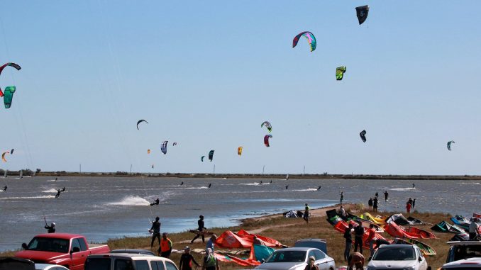 Надо сказать, что сам вид спортсменов, летающих на досках под действием силы тяги воздушных змеев, особенно в период бархатного морского сезона, был очень эффектным. Живописные окрестности курорта, высокая небесная синь и разноцветные кайты создавали жизнерадостное, приподнятое настроение даже у тех, кто вообще не интересуется спортом, но ценит оправданный риск, единение с ветром и красоту.