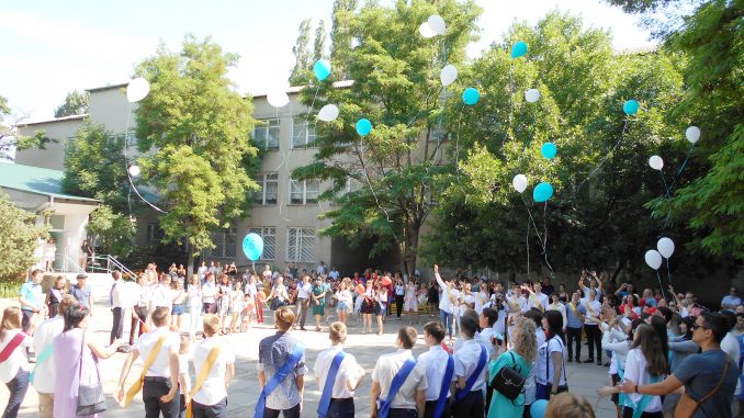 Татьяна Петровна вручила награды «звездочкам науки» — шести отличникам среди девятиклассников, свидетельства – всем выпускникам. Ребята поблагодарили всех своих преподавателей, начиная от первых учителей, и праздник продолжился песнями, танцами, трогательным школьным вальсом с родителями. В небо были выпущена стая разноцветных шаров под крики молодежи: «Прощай детство!» Завершил торжество флеш-моб, антуражем которому послужил цветной дым и небольшой фейерверк. Далее выпускники зафиксировали важный для себя этап возле специальной арки из воздушных шаров, да и родители не остались в стороне от знакового момента. В счастливом переполохе мероприятия, я попросила двух отличниц из 9-Б – Эллину Пономареву и Алину Генову поделиться впечатлениями от праздника и рассказать свои дальнейшие планы. «Нам очень понравилось, -мы сами его готовили, но на репетициях не было того эффекта, каким сегодня отличился наш выпуск из родной школы». Как оказалось, Эллина намеревается продолжить учебу в родном заведении, далее собирается поступать в Киевский университет, чтобы выучиться на журналиста или психолога. Алина же поступает в Белгород-Днестровское медучилище, после окончания — в харьковскую Фармакадемию. Девушка считает, что окончание 9 класса, это ступень во взрослую жизнь, в которой успех зависит только от тебя самого.. Остается пожелать всем бывшим девятиклассникам славно отметить праздник в «Перехватчике», кому удастся отдохнуть – хороших каникул, а абитуриентам – удачного поступления.